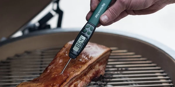 Il termometro digitale a lettura rapida di Big Green Egg è piccolo e compatto. Tienilo a portata di mano in modo da poter controllare rapidamente se la carne è pronta. Si spegne automaticamente dopo 5 minuti per risparmiare le batterie (incluse).
