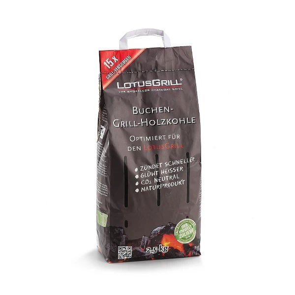 Il carbone di faggio per barbecue LotusGrill vanta un contenuto di carbonio estremamente elevato e un potere calorifico altissimo, il che significa che si accende particolarmente rapidamente e brucia più caldo e più a lungo rispetto al carbone convenzionale.