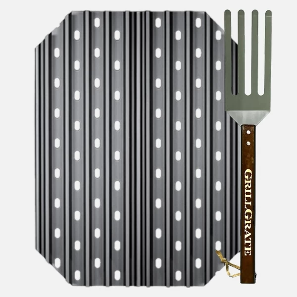 Ogni set viene fornito con un GrateTool che è in parte una forchetta e in parte una spatola che si inserisce tra i binari per entrare sotto il cibo e sollevarlo senza raschiare.